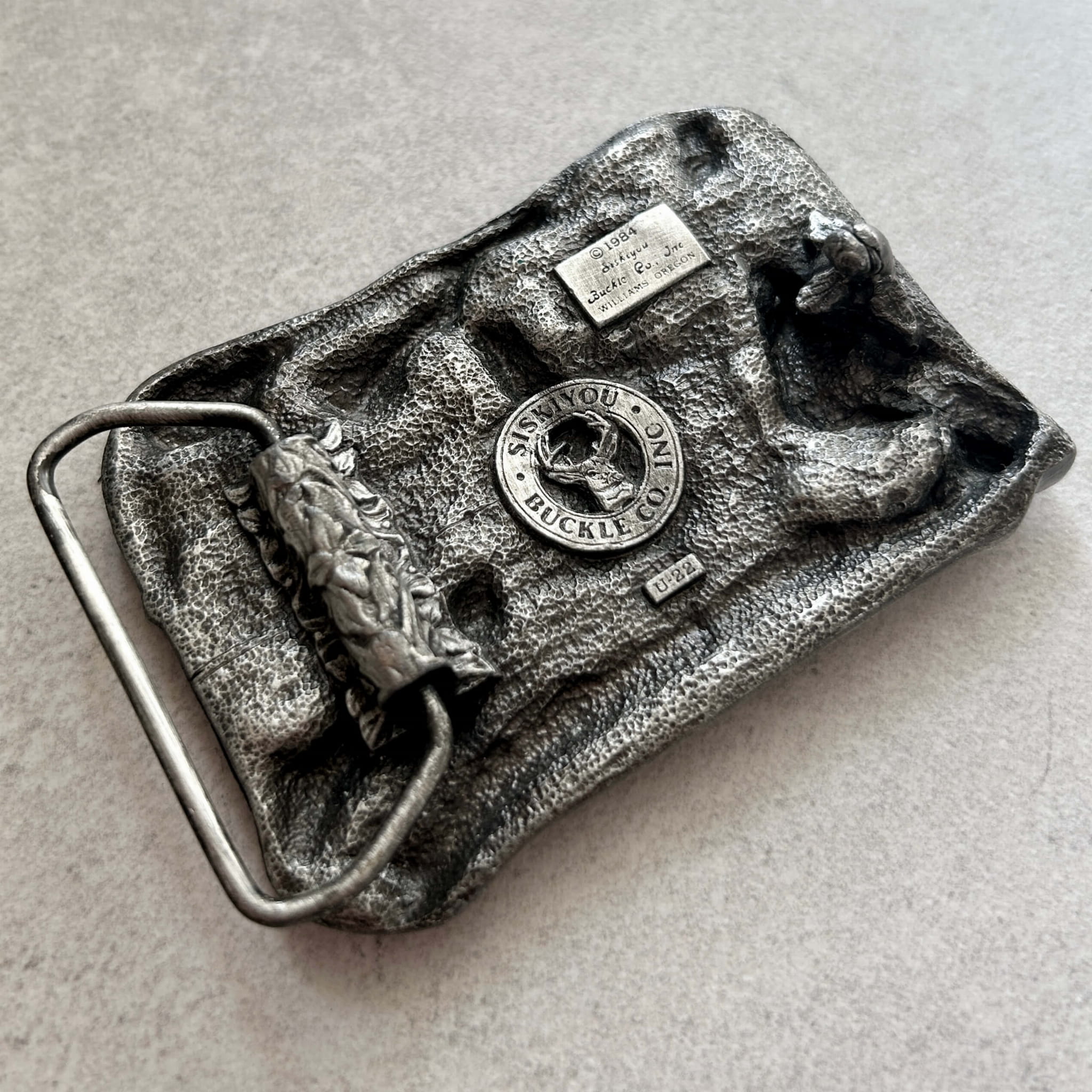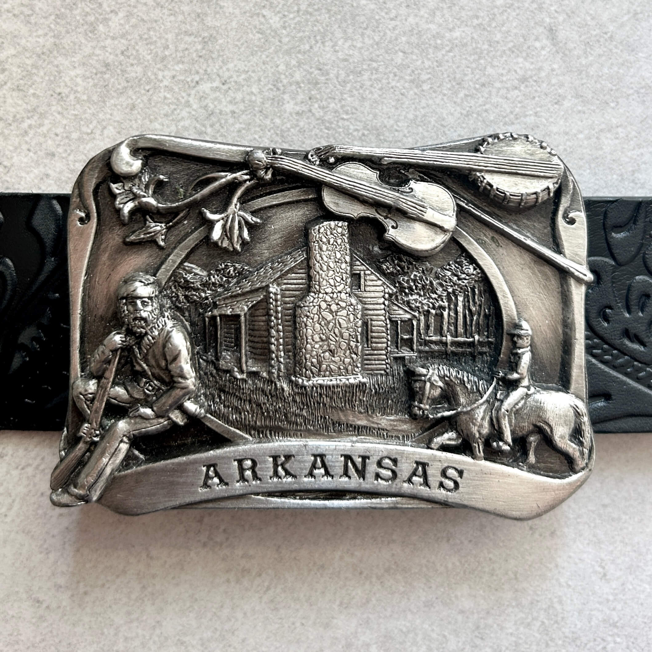 Oryginalna sygnowana klamra kolekcjonerska z USA z 1984 roku. Klamra z motywami stanu Arkansas, znanego jako "Stan Naturalny" (The Natural State). Pięknie wykonana przez znanego producenta klamer Siskiyou Co. Na odwrocie sygnatury. Stan bardzo dobry z niewielkimi śladami czasu. Pasuje do paska o szerokości 40 mm. Zgrabna klamra o wymiarach: ok. 85 mm x 60 mm.
