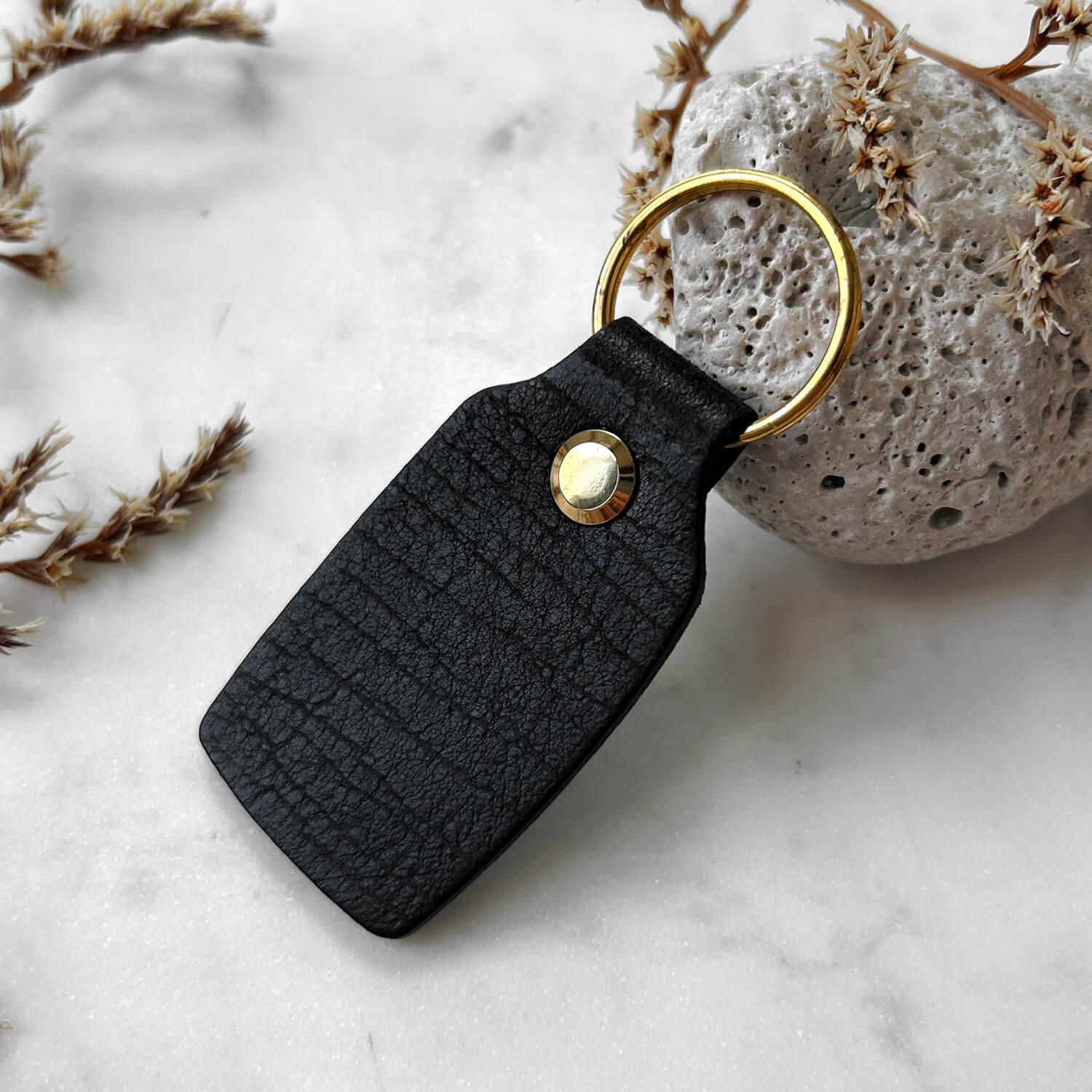 Klasyczny, wygodny brelok do kluczy w kolorze czarnym z fakturowanej skóry (skóra czarna buffalo). Może służyć samodzielnie, jak i jako dodatkowa szlufka na pasek.