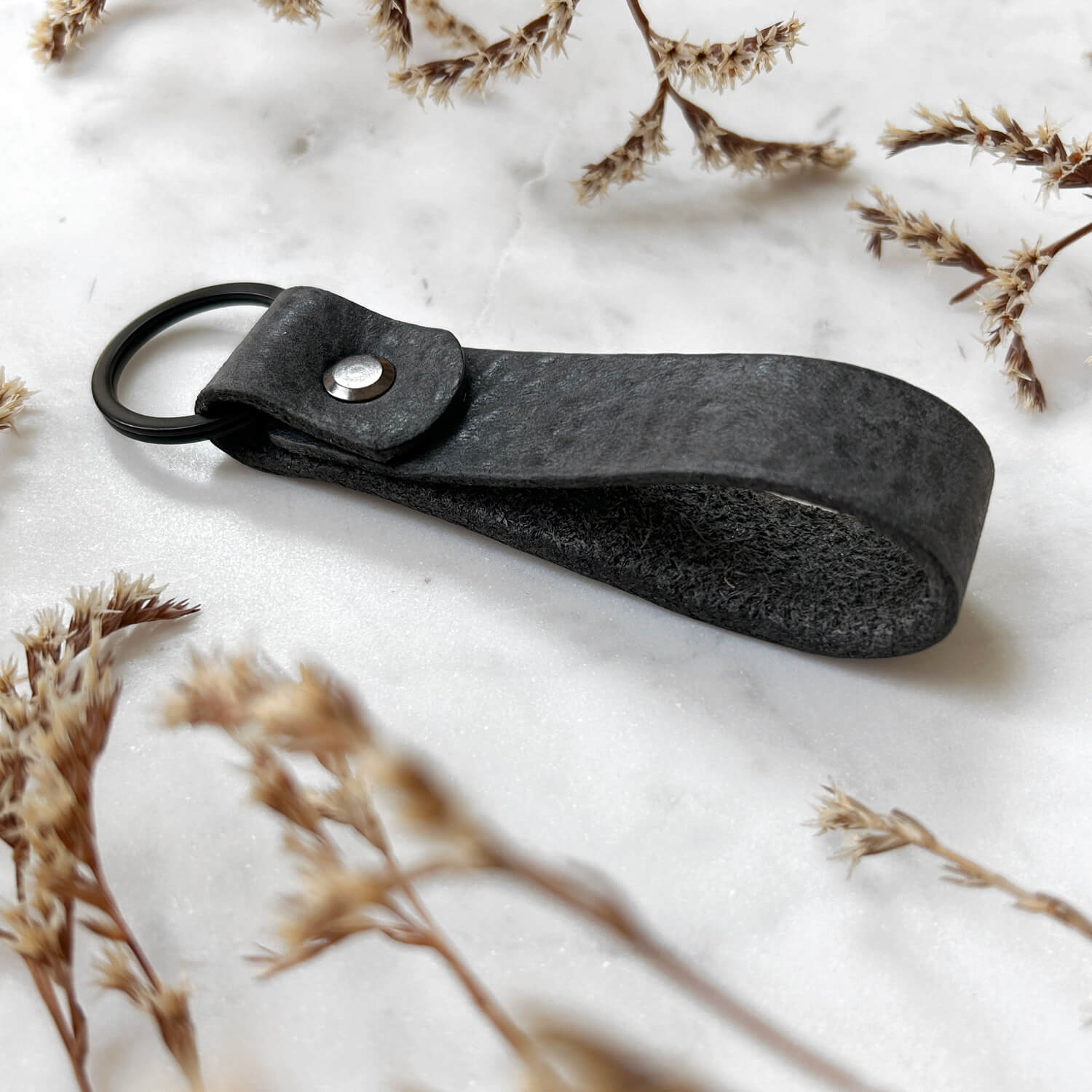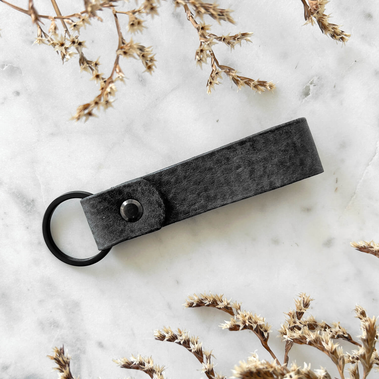 Klasyczny, wygodny brelok do kluczy w kolorze grafitowym (skóra grafit dallas). Może służyć samodzielnie, jak i jako dodatkowa szlufka na pasek.