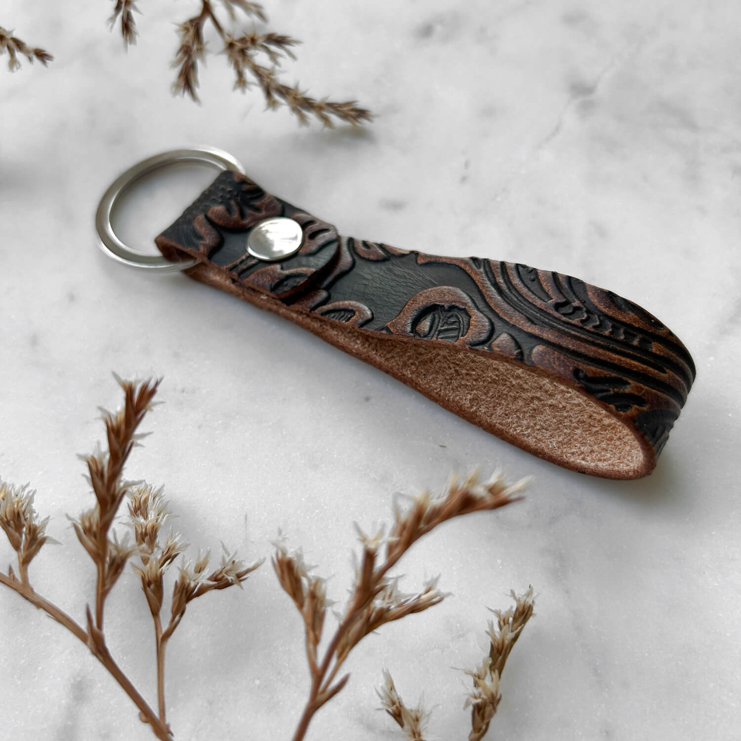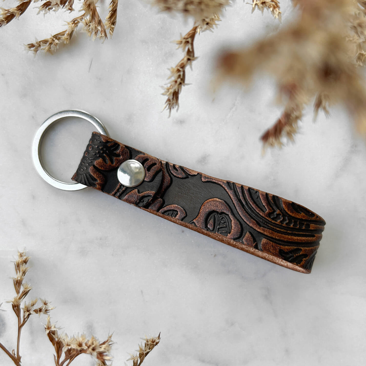 Klasyczny, wygodny brelok do kluczy w kolorze brązowym (skóra brąz vintage flower). Może służyć samodzielnie, jak i jako dodatkowa szlufka na pasek.