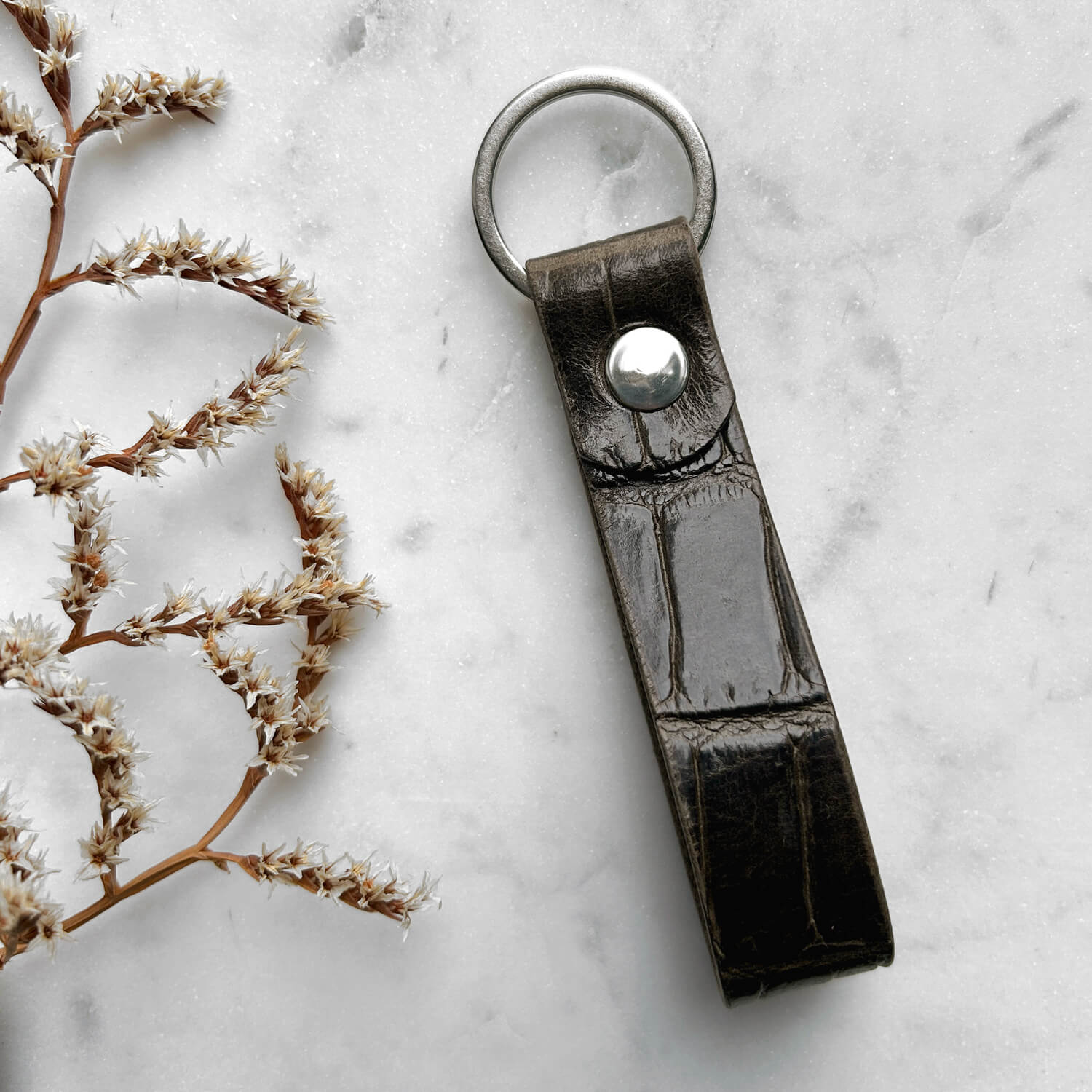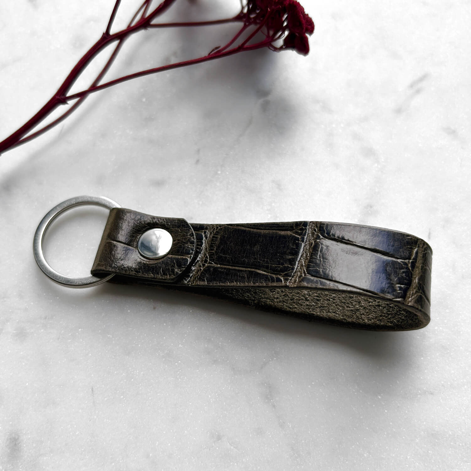 Klasyczny, wygodny brelok do kluczy w kolorze oliwkowym (skóra oliwkowa kroko). Może służyć samodzielnie, jak i jako dodatkowa szlufka na pasek.