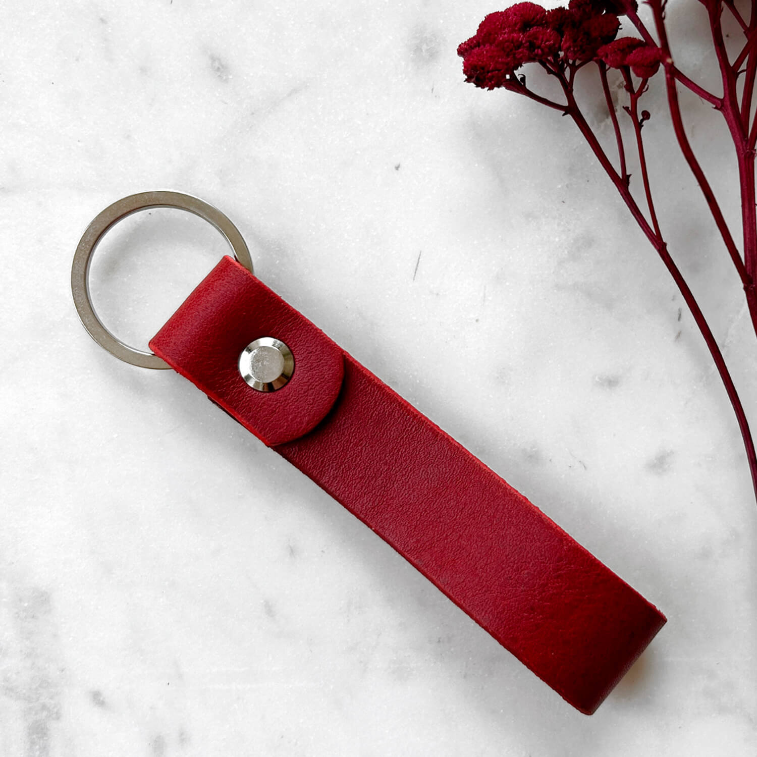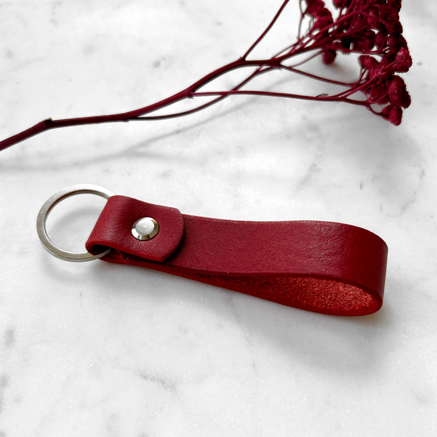 Klasyczny, wygodny brelok do kluczy w kolorze czerwonym (skóra czerwona ponczo). Może służyć samodzielnie, jak i jako dodatkowa szlufka na pasek.