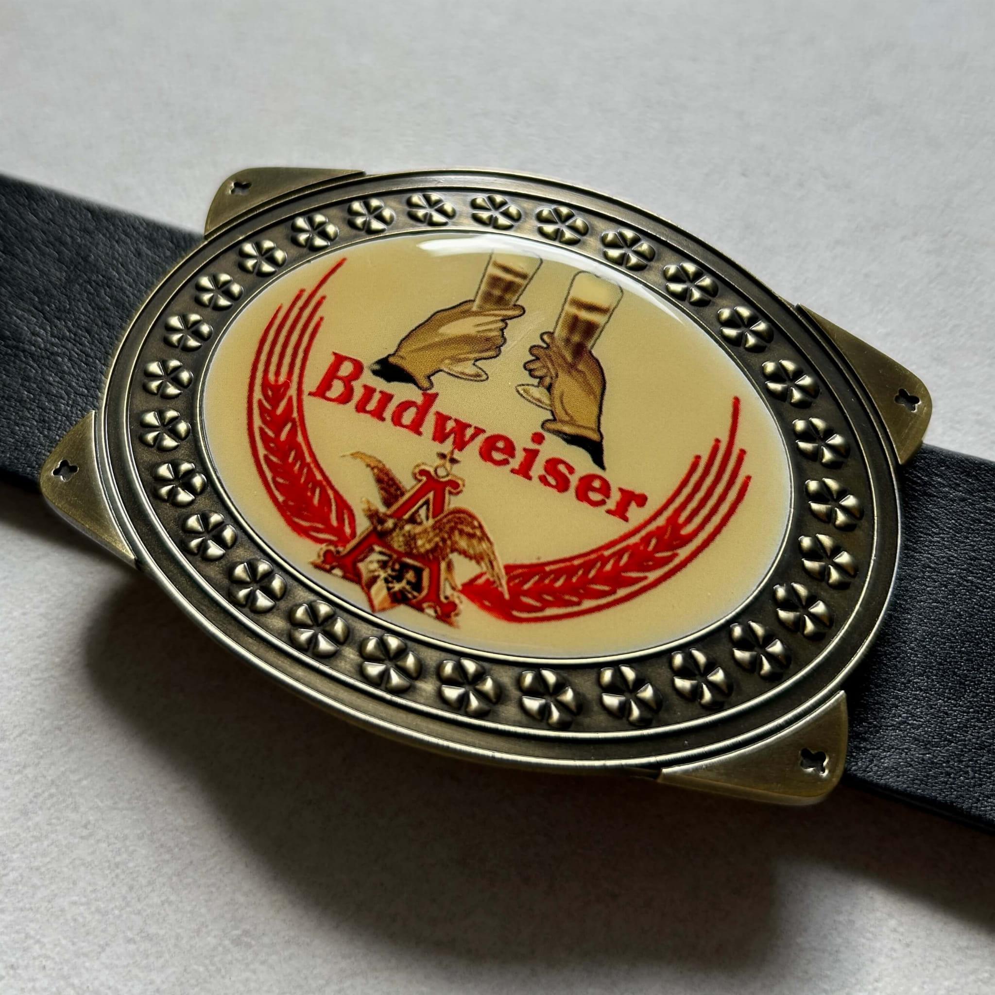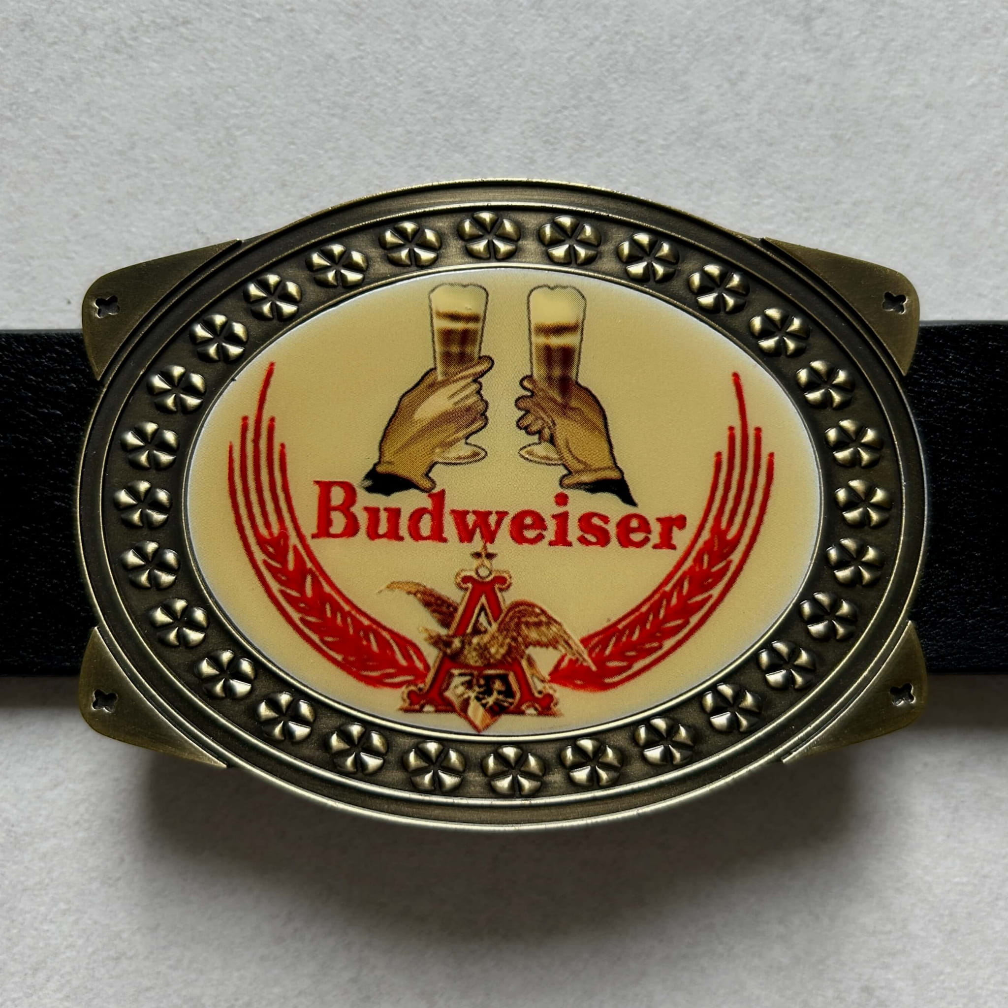 Oryginalna klamra kolekcjonerska z USA pochodząca z lat 1980/90 z motywem piwnego toastu oraz logo marki Budweiser i Anheuser-Busch - amerykańskiego producenta piwa. Stan bardzo dobry. Pasuje do paska o szerokości 40 mm. Klamra o wymiarach: ok. 90 mm x 65 mm.