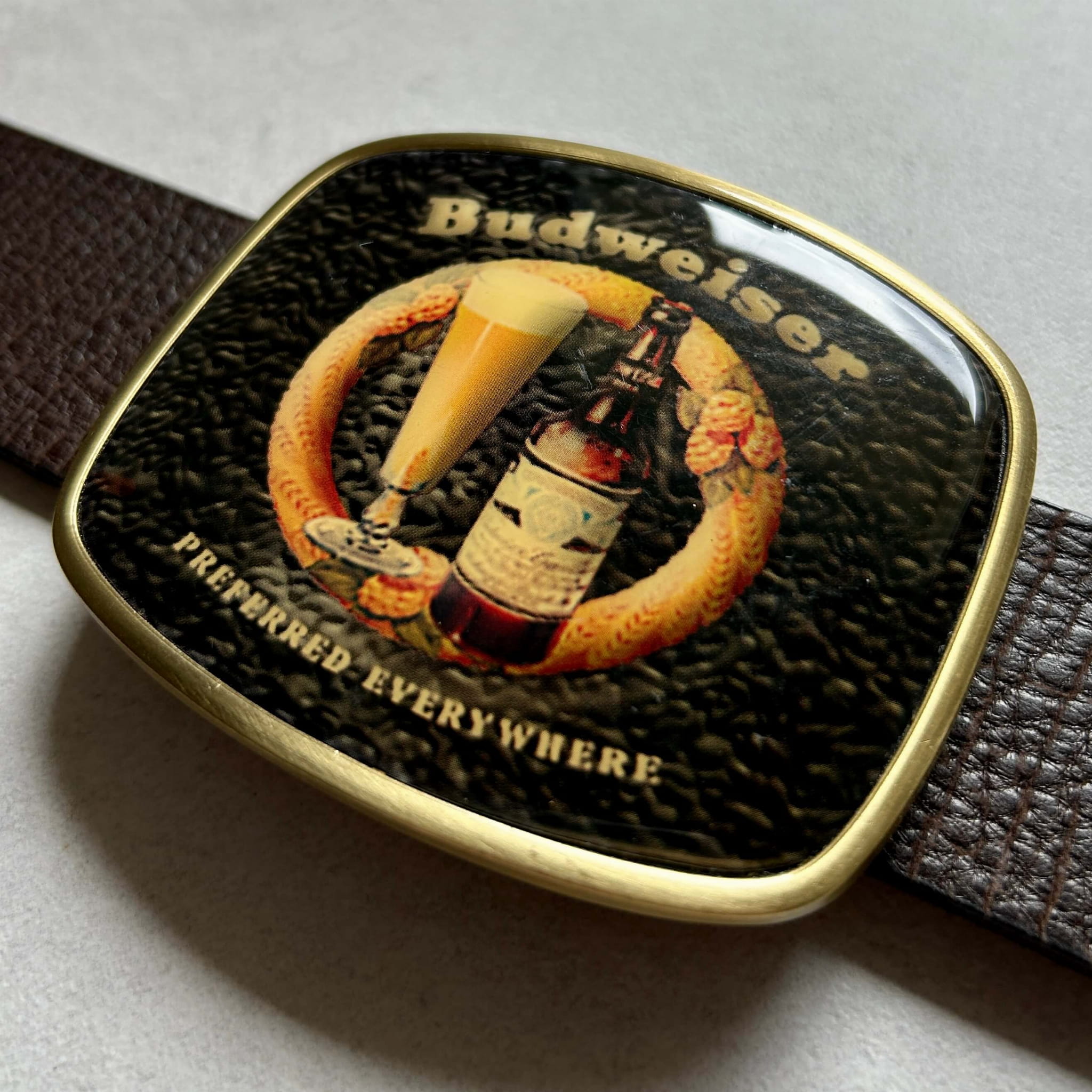 Oryginalna klamra kolekcjonerska z USA pochodząca z lat 1980/90 z motywem szklanki i butelki piwa marki Budweiser, znanej amerykańskiej firmy piwowarskiej. Stan bardzo dobry. Pasuje do paska o szerokości 40 mm. Klamra o wymiarach: ok. 85 mm x 70 mm.