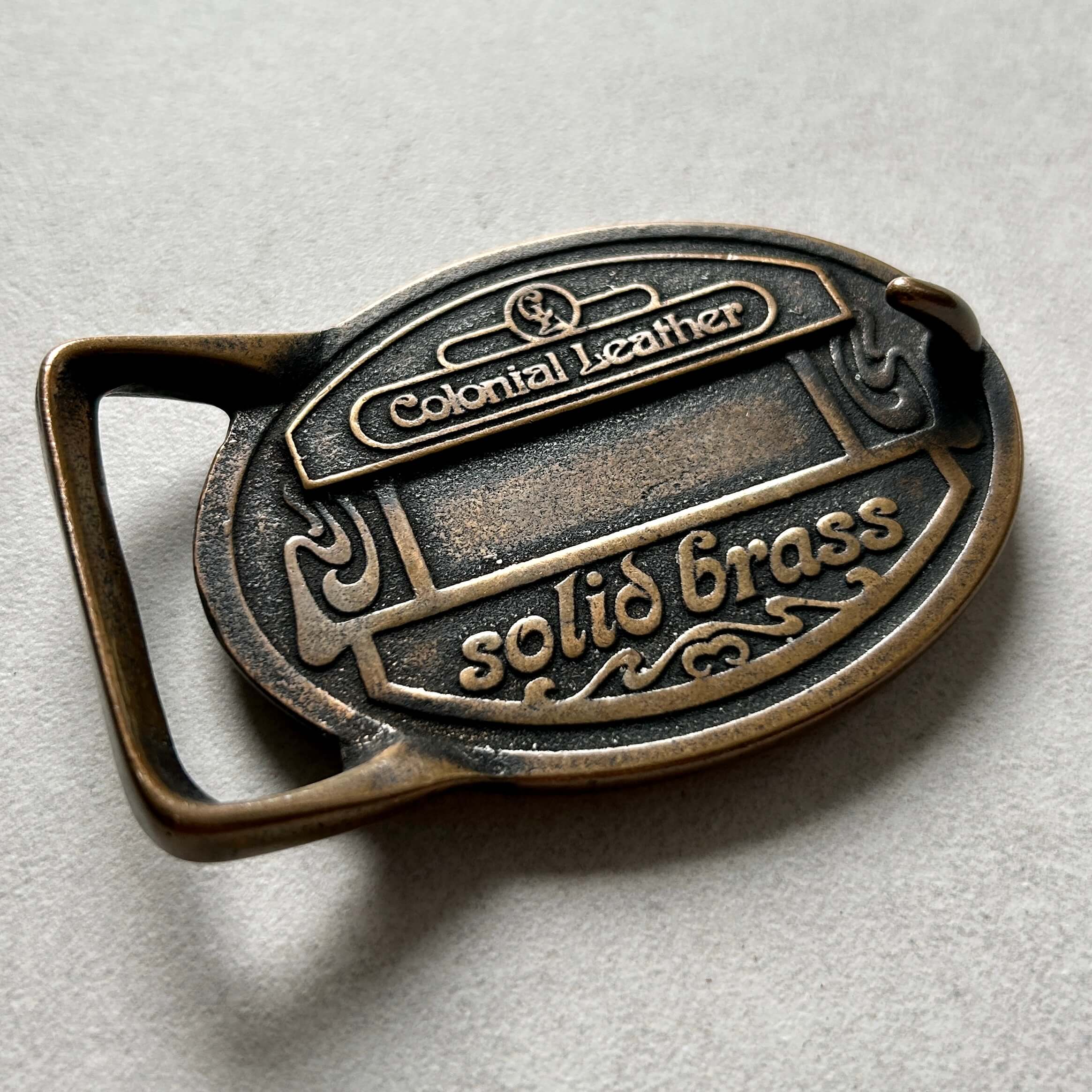 Stylowa i wyjątkowa klamra wykonana przez amerykańską firmę Colonial Leather w latach 1970/80. Model ten powstał z połączenia litego mosiądzu (solid brass) oraz ręcznie tłoczonej skóry naturalnej, co nadaje mu charakterystyczny, ciepły wygląd w stylu retro.