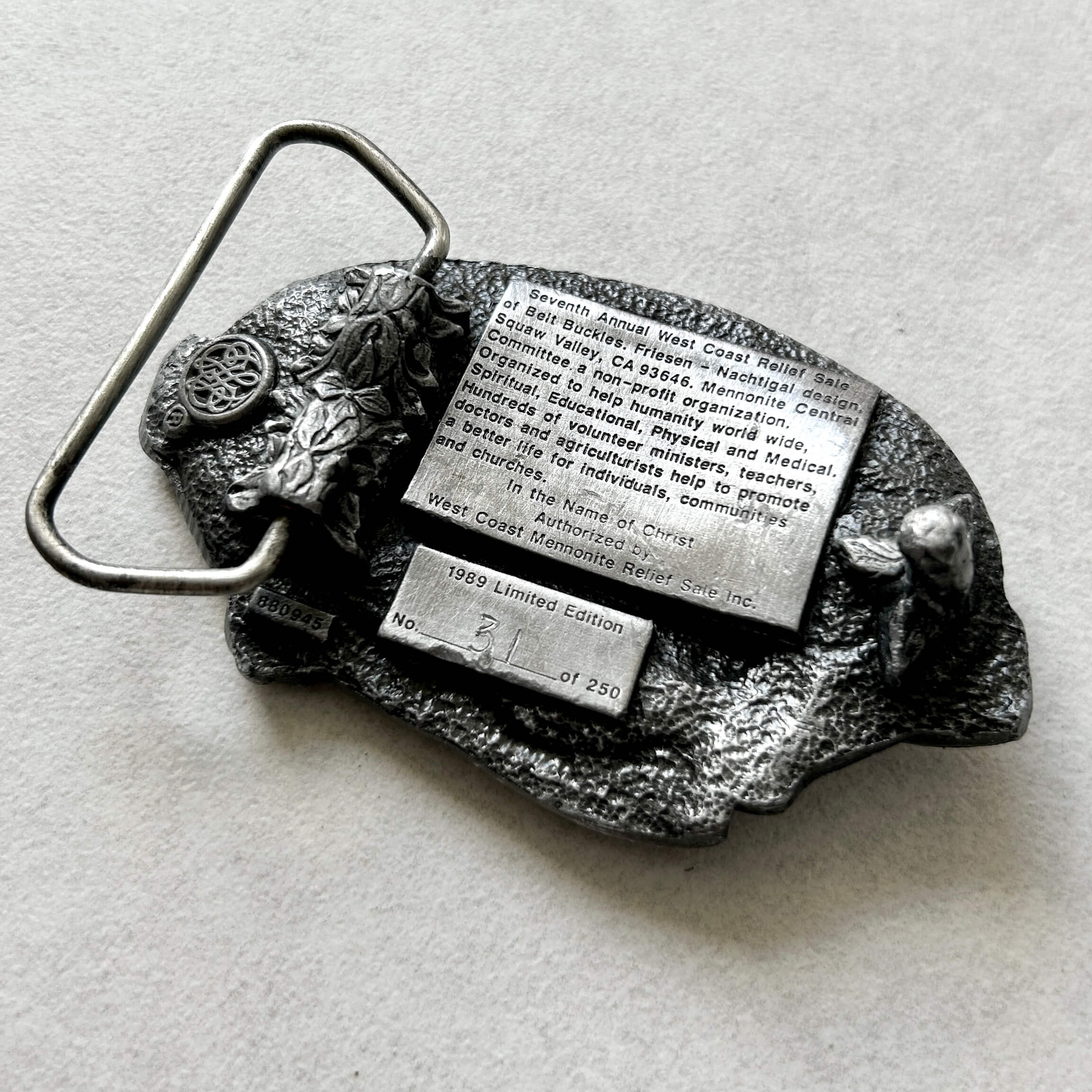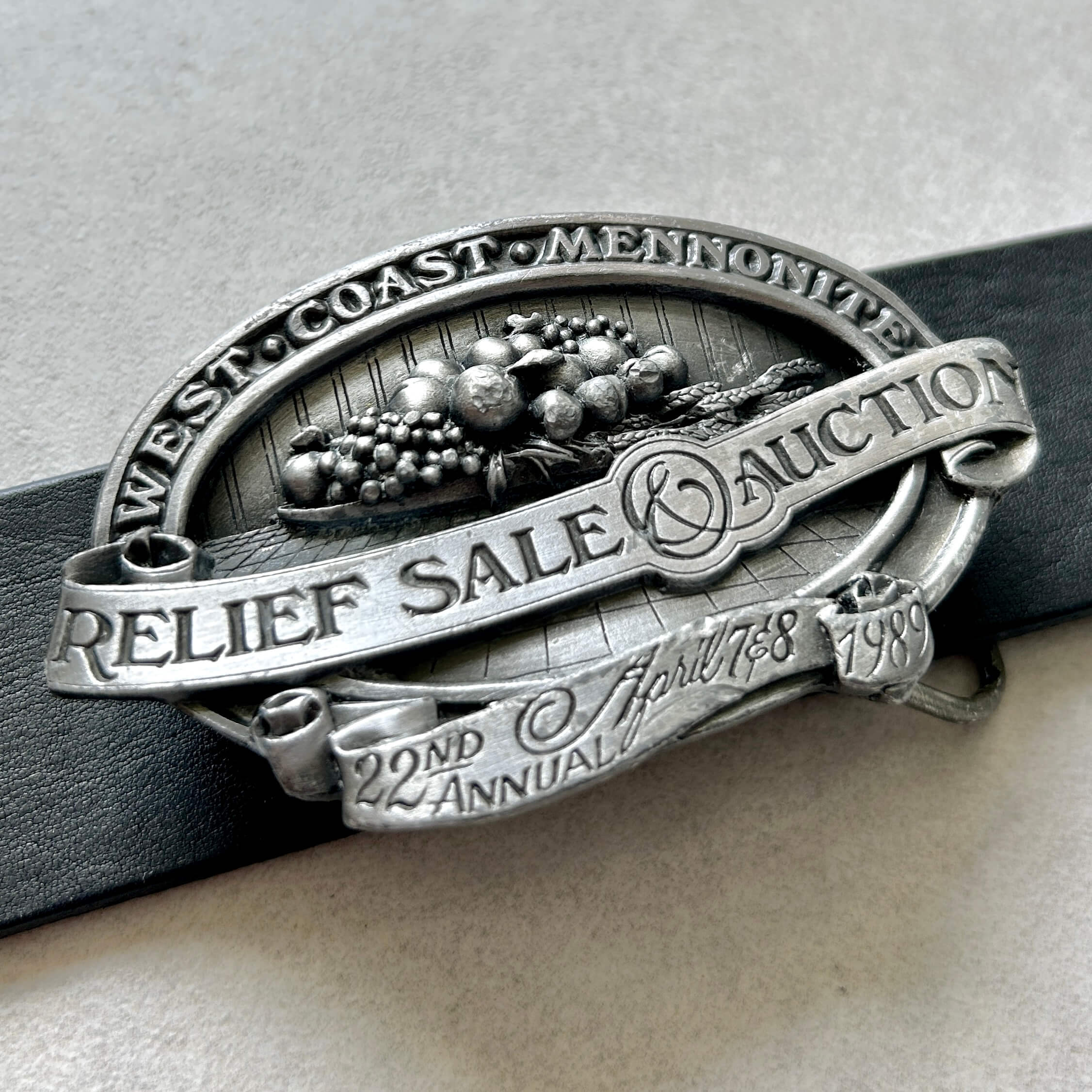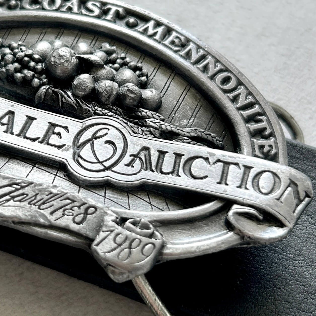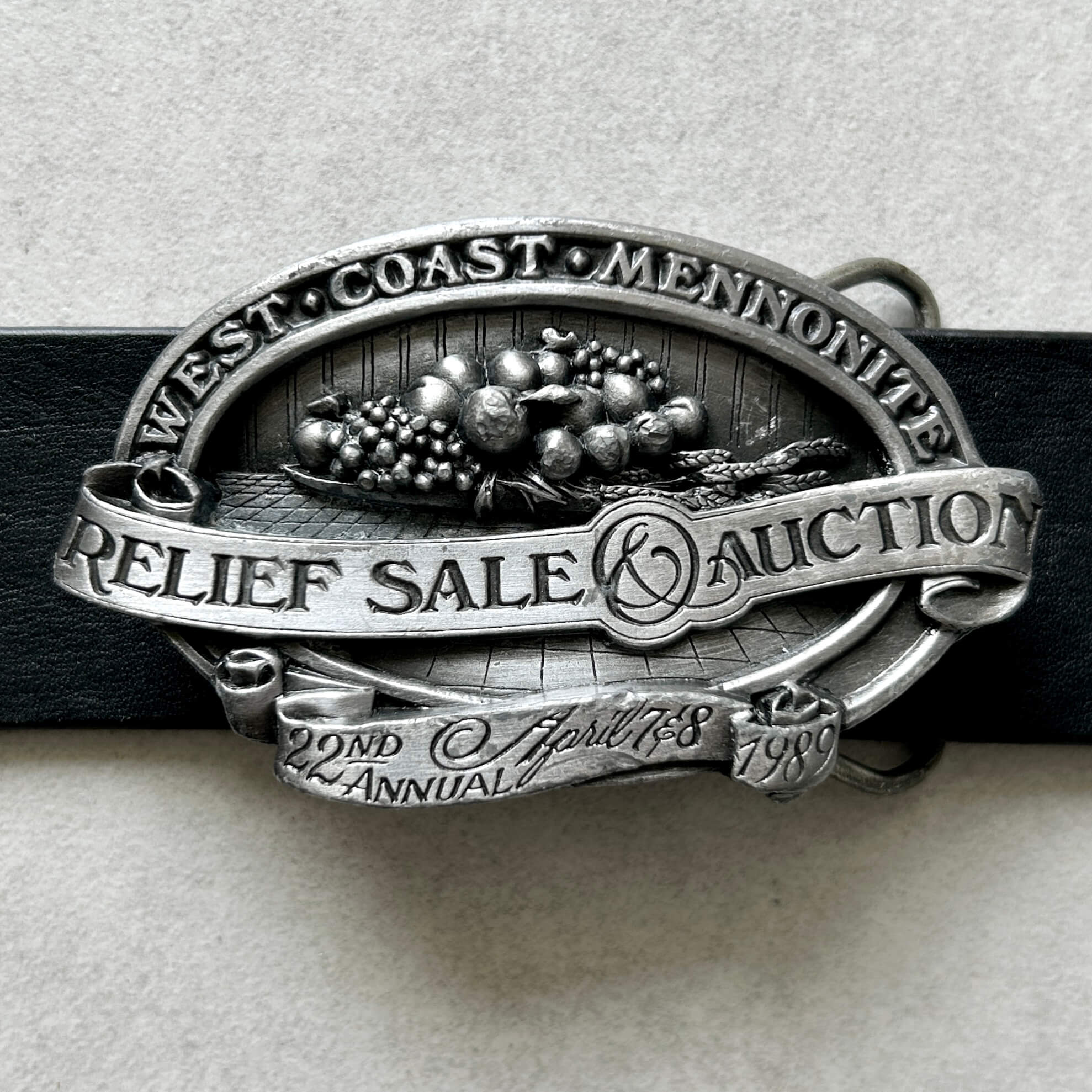 Oryginalna sygnowana i limitowana klamra kolekcjonerska z USA z 1989 roku. Klamra upamiętnia działalność charytatywną wspólnoty menonitów w USA, a dokładniej 22. doroczną aukcję charytatywną. Głównym motywem jest kosz z owocami i kłosami zbóż – symbolami obfitości, pracy i wspólnoty. Klamra wyprodukowana przez słynną markę Bergamot Brass Works. Na odwrocie znajduje się krótka informacja o organizacji i wydarzeniu oraz unikalny numer seryjny. Stan bardzo dobry z niewielkimi śladami czasu. Pasuje do paska o szerokości 40 mm. Zgrabna klamra o wymiarach: ok. 85 mm x 50 mm.