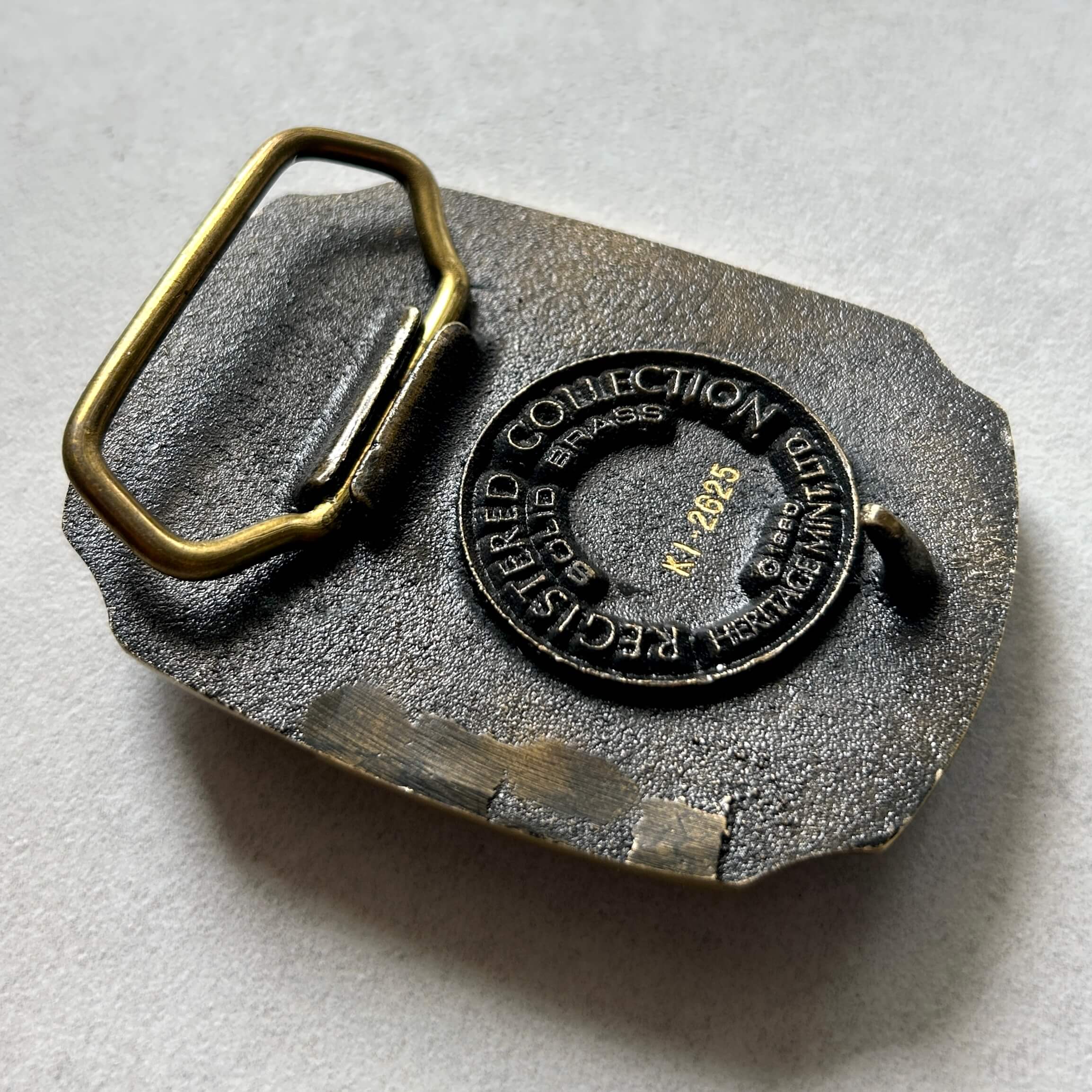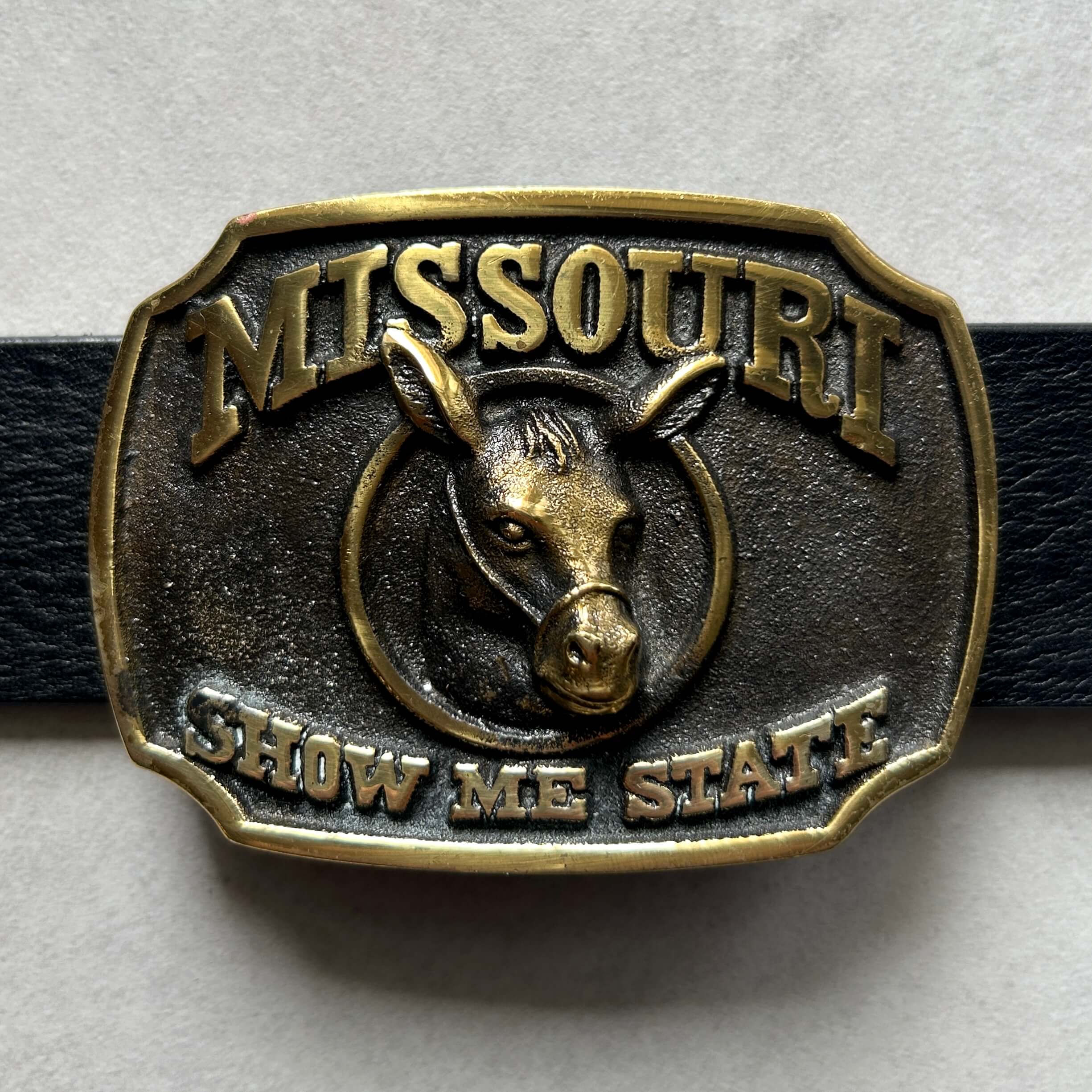 Oryginalna sygnowana i limitowana klamra kolekcjonerska z USA z 1980 roku. Klamra z motywem stanu Missouri . "Show Me State" jest mottem stanu Missouri ze względu na sceptyczną naturę mieszkańców, którzy wymagają dowodów, zanim w coś uwierzą. Osioł, jako zwierzę kojarzone z uporem i niezależnością, dobrze oddaje ten etos, a przy tym jest także tradycyjnym symbolem Partii Demokratycznej w Stanach Zjednoczonych. Pięknie wykonana z litego mosiądzu przez Herritage Mint, LTD. Na odwrocie sygnatura i unikalny numer seryjny. Stan bardzo dobry z niewielkimi śladami czasu. Pasuje do paska o szerokości 40 mm. Klamra o wymiarach: ok. 85 mm x 65 mm.