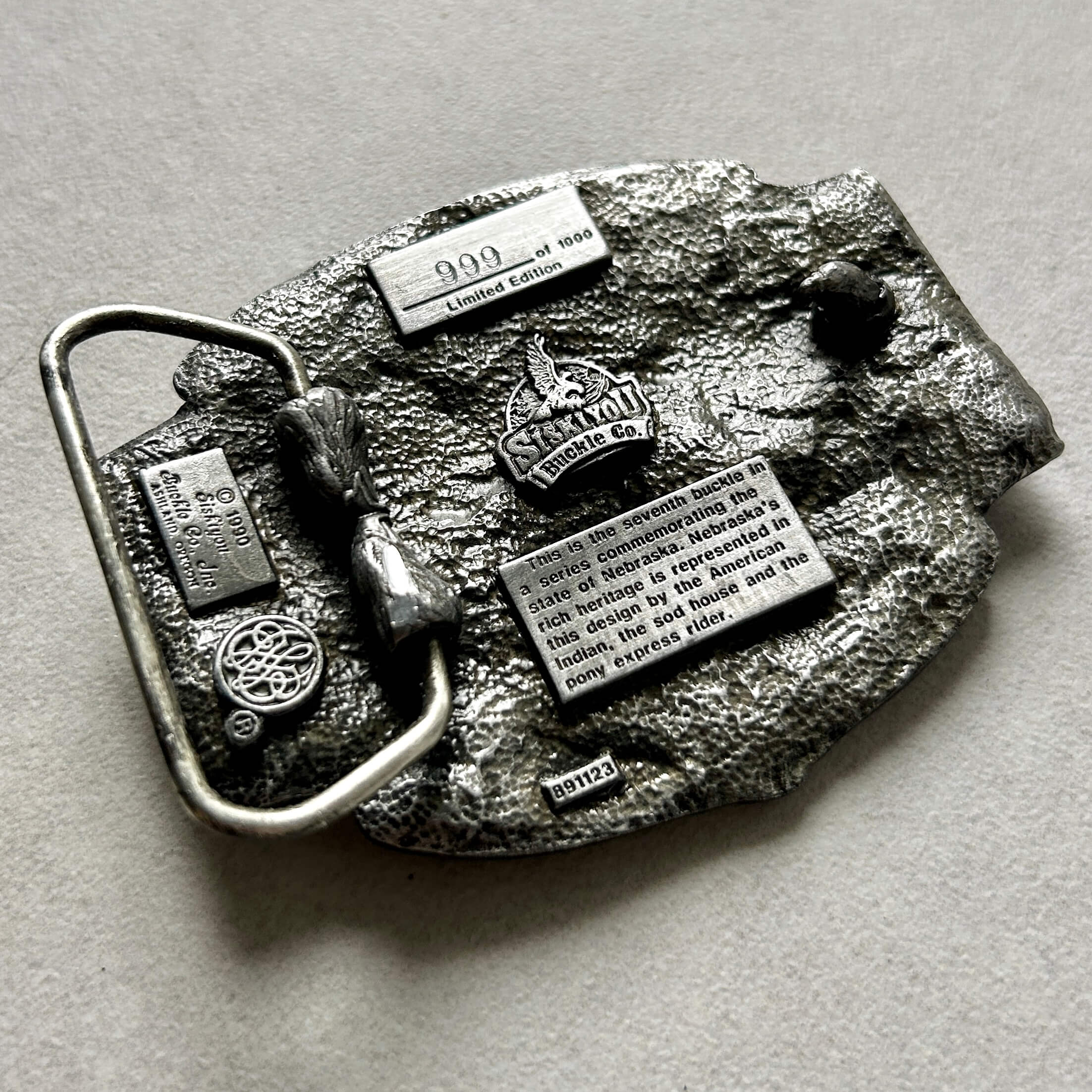 Oryginalna limitowana klamra kolekcjonerska z USA z 1990 roku, upamiętnia symbolikę stanu Nebraska, przedstawiając wizerunek Indianina amerykańskiego. Na odwrocie unikalny numer seryjny: 999 z 1000 limitowanych sztuk. Stan bardzo dobry. Pasuje do paska o szerokości 40 mm. Klamra o wymiarach: ok. 80 mm x 65 mm.