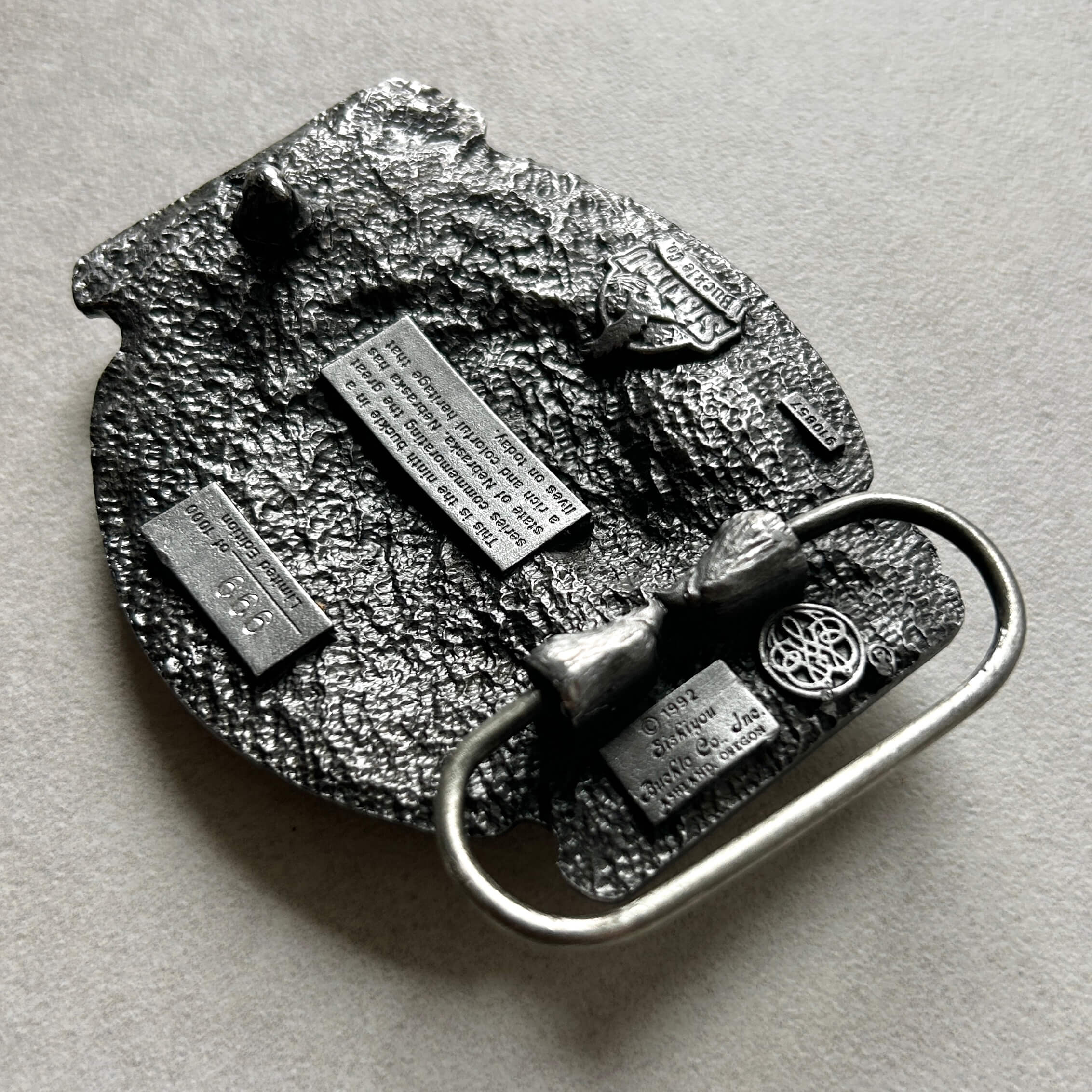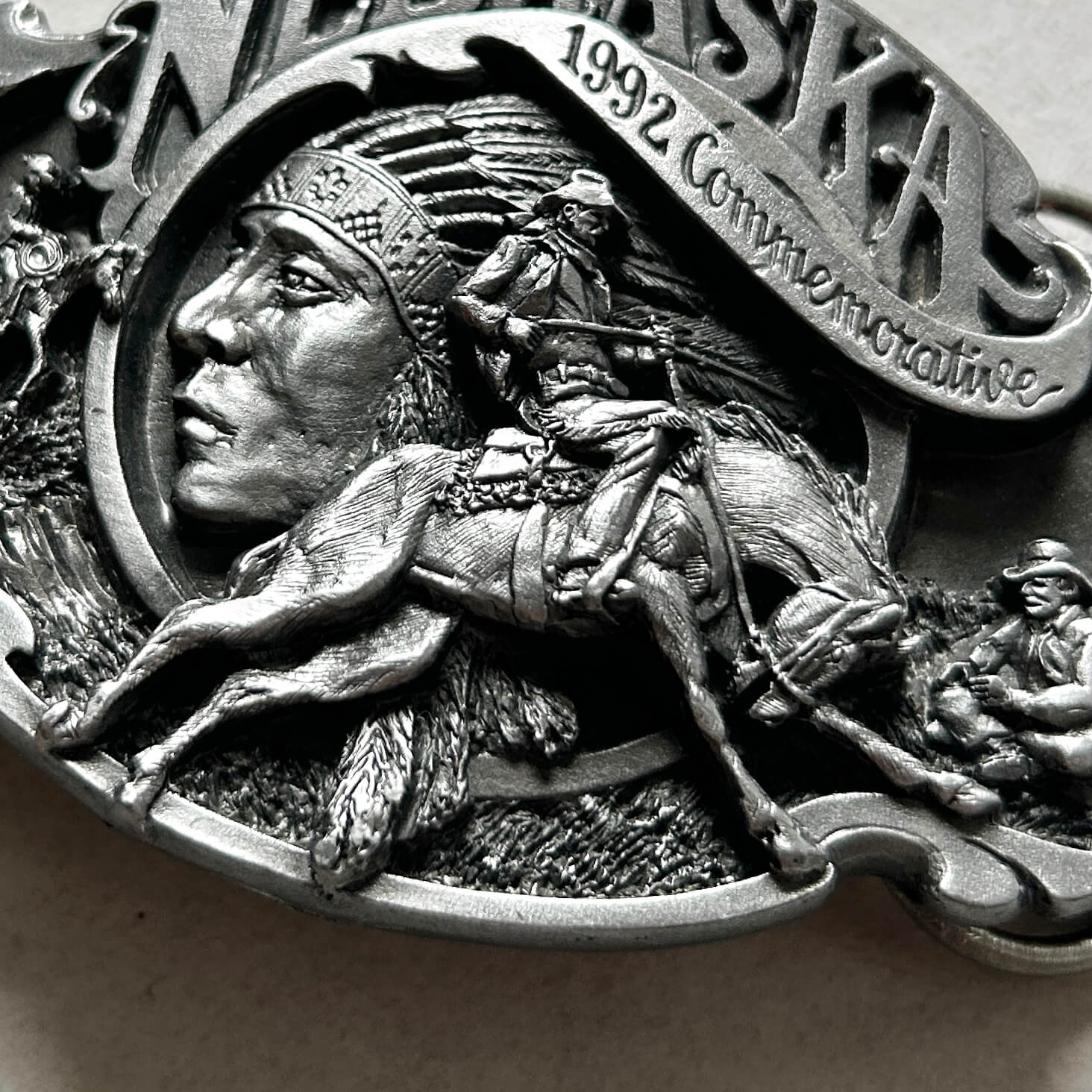 Oryginalna limitowana klamra kolekcjonerska z USA z 1992 roku. Upamiętnia bogate dziedzictwo stanu Nebraska. Klamra przedstawia scenę rolniczą i rdzenną ludność Ameryki. Na odwrocie unikalny numer seryjny, 999 z 1000 limitowanych sztuk. Stan bardzo dobry. Pasuje do paska o szerokości 40mm. Klamra o wymiarach: ok. 80 mm x 65 mm.